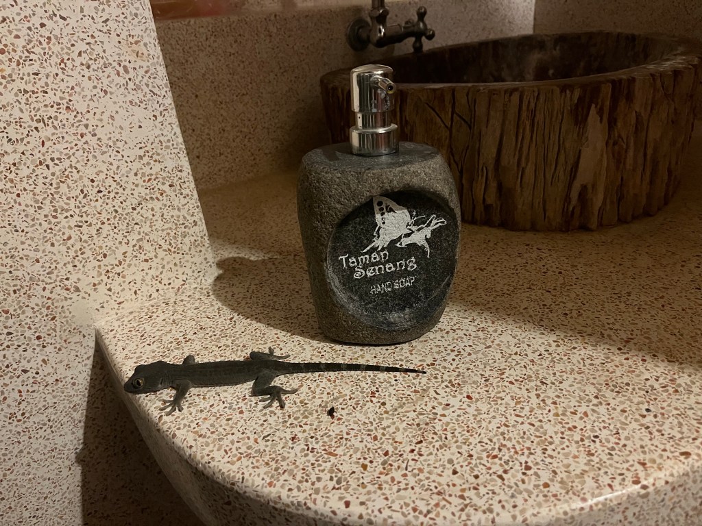 On the islands, the showers are often open-air. Enjoy the fun of it and turn on the light before you go in to give the little creatures time to scatter.