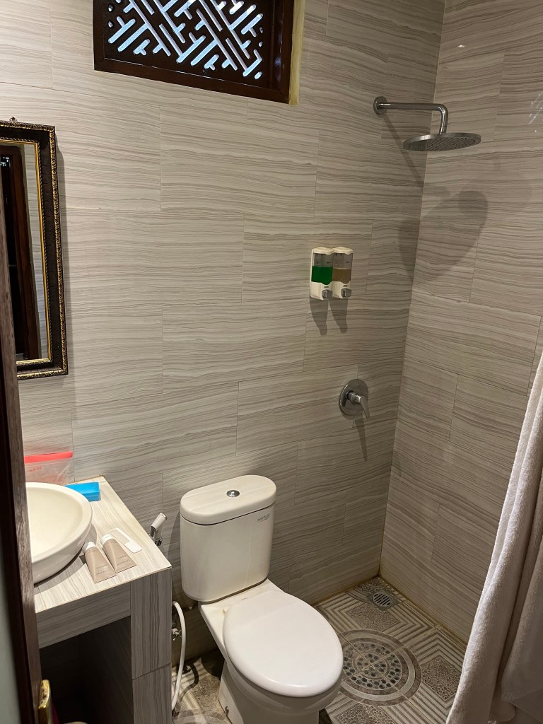 The bathroom often is an all-in-one situation so water from the shower goes everywhere. Our best advice – keep the toilet lid closed at all times. The water usually dries quickly