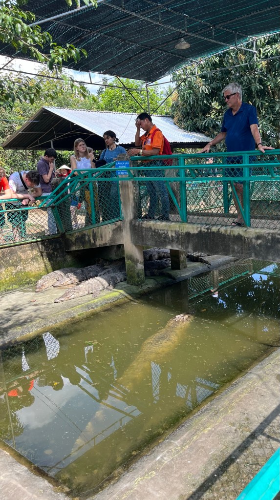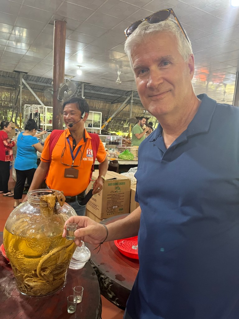 Ben Tre province was next where we saw a coconut candy factory. The candy was yummy! They also had a number of crocodile leather items for sale and an interesting fermented snake liquor.