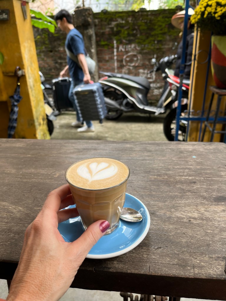 With time to spare, we found a cool little coffee shop at the end of the alley and, though I had to hop out twice, once to try on my sandals and then again to pick them up, I enjoyed my first ‘egg coffee’ in Vietnam.