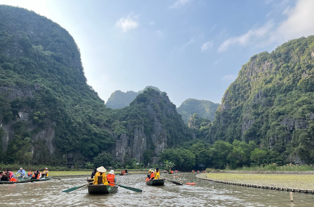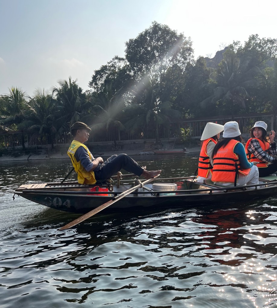The final stop on our Ninh Binh tour was a boat ride along the Ngo Dong river. The “boatmen” who, from what we experienced were mostly women, take tourists in wooden boats up and down the river, going through 3 caves and past riverside rice fields. It is tiring work to be sure, and the local people have mastered the skill of rowing with their feet, making the hard work of rowing, a little easier for them and the tourists find it very entertaining as well.